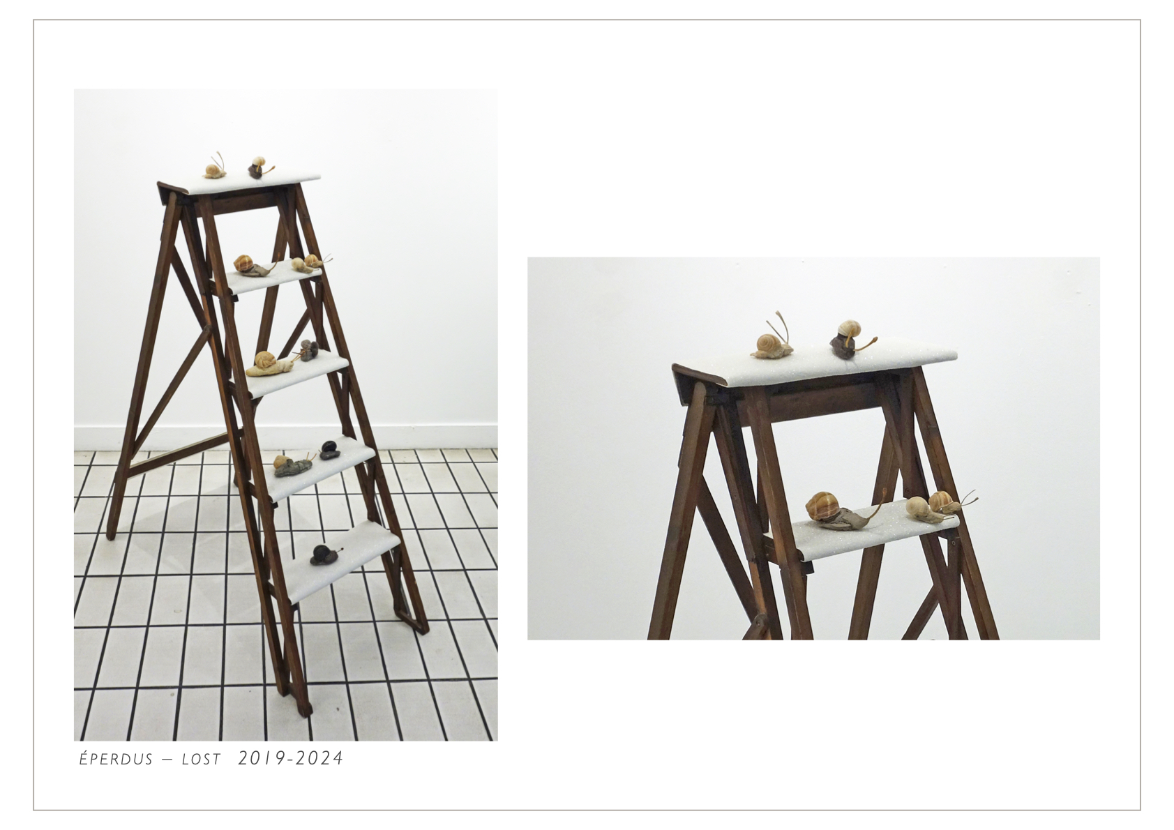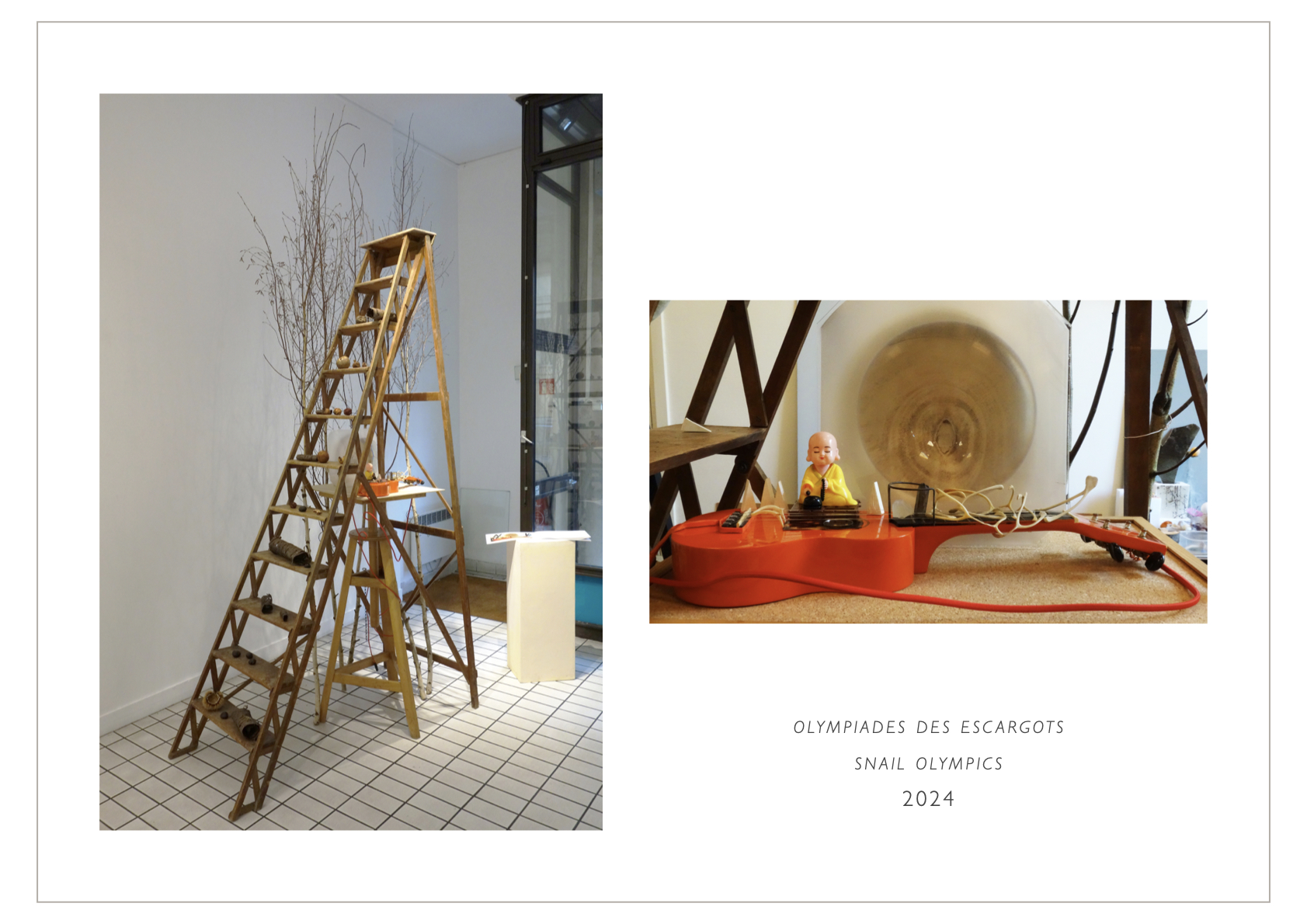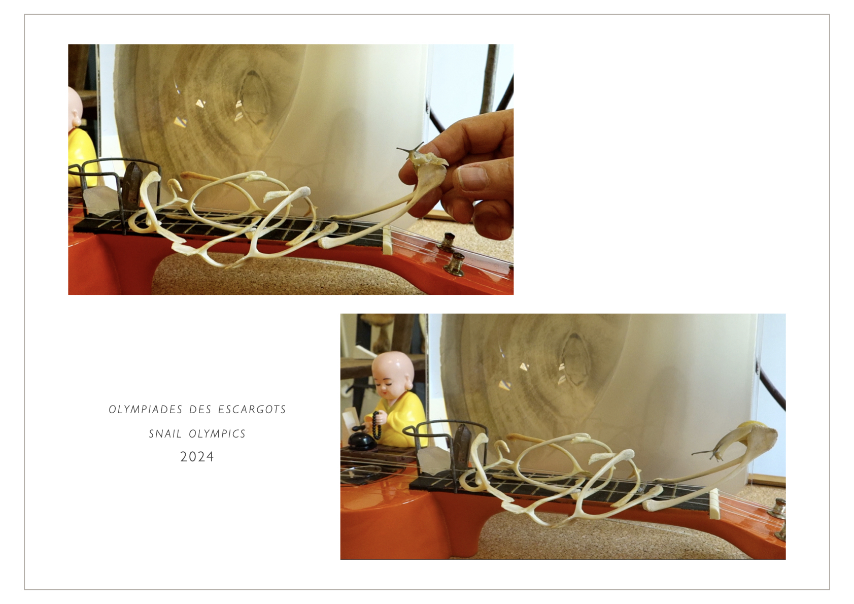 Le plaisir de montrer la beauté intrinsèque des escargots à la fois simple et complexe m’a conduite à solliciter leur participation dans un terrain de jeu où ils pouvaient livrer les vibrations de leur appréhension intuitive en résonnance avec l’espace sonore d’une guitare ukulélé. L’instrument est animé par le mouvement perpétuel des percussions produites par un moine en jouet muni d’une cellule photoélectrique.