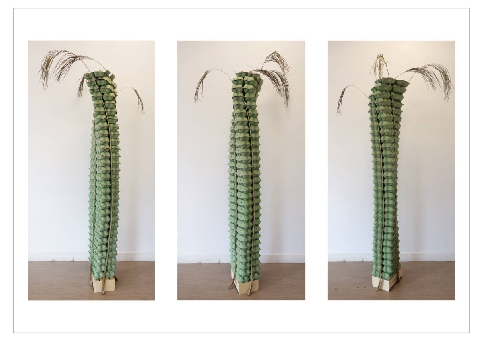 Au fond de l’espace central, la colonne intitulée Horizon unanime est une construction en boîtes d’œufs empilées et maintenue de chaque côté par des tiges de palmier. Deux stores en bambou évoquant les raies de lumière tropicale qui rendait savoureuses les siestes que je faisais avec Mémé.