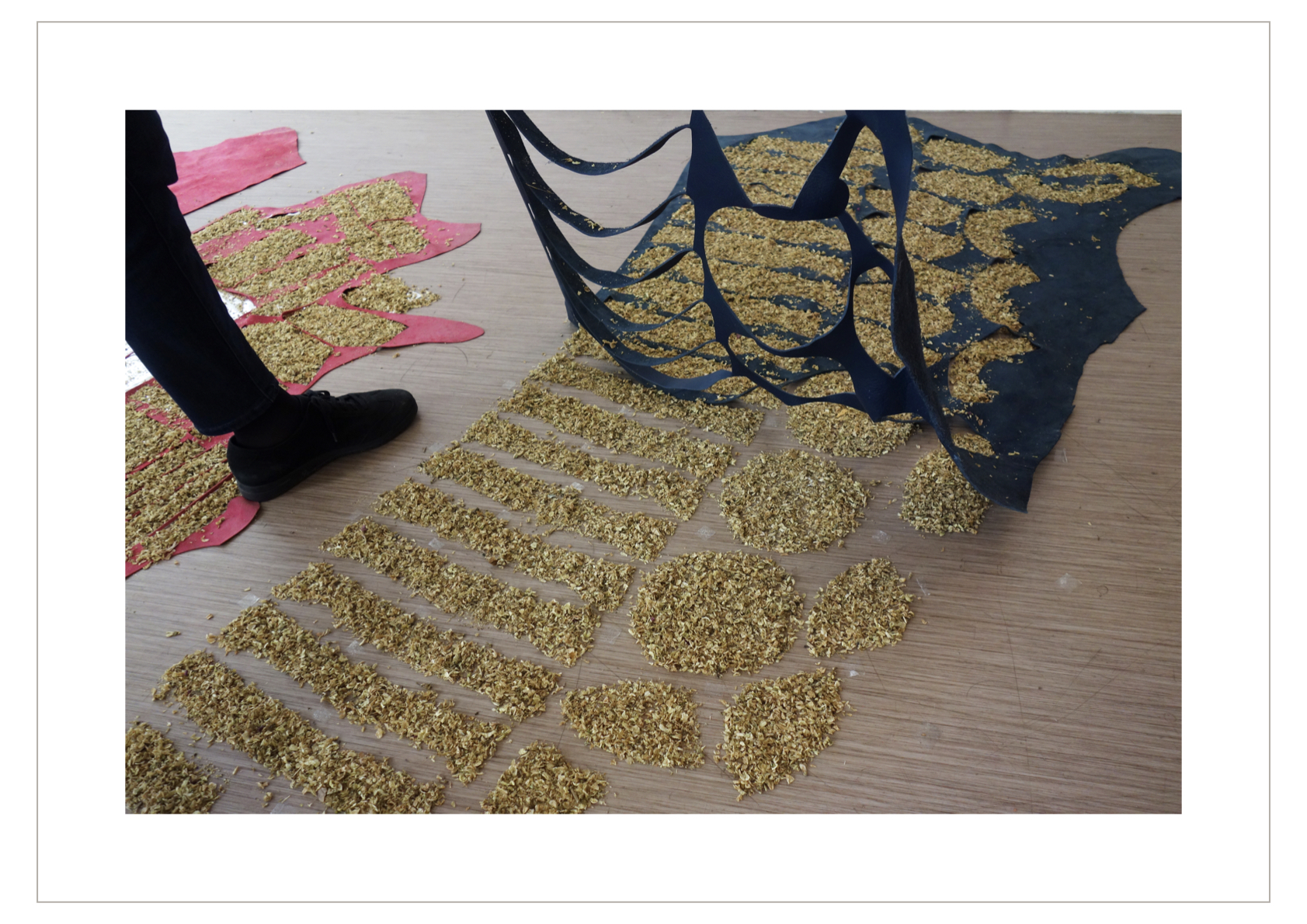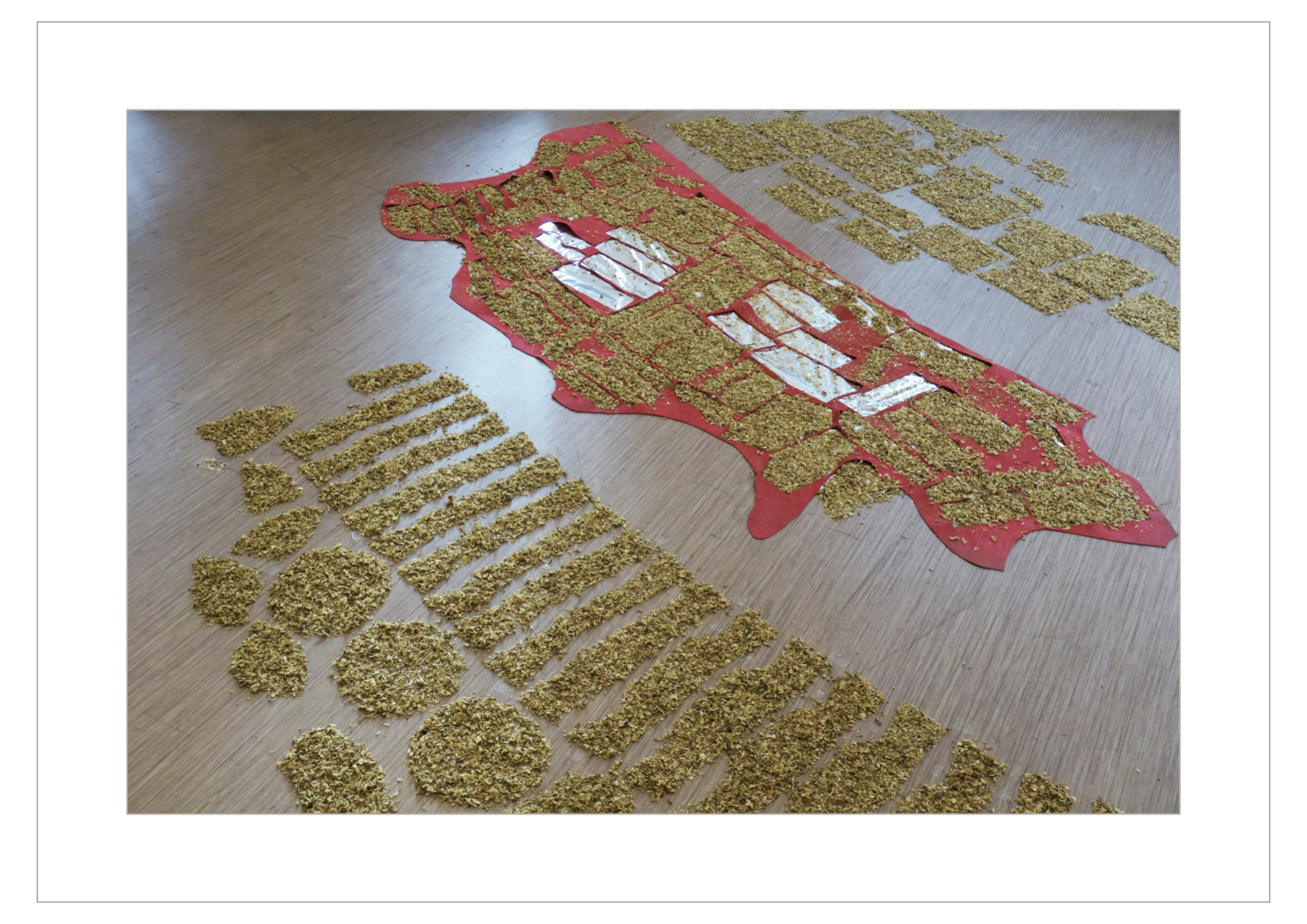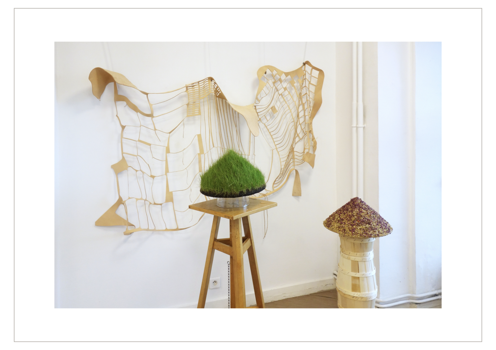 L’espace de droite simule une vue aérienne de la plantation de Mémé, avec ses parcelles de fleurs de sophora représentant des parcelles de champs, délimitées par des peaux « squelettes de cuir » évidées des formes soustraites à l’emporte-pièce.