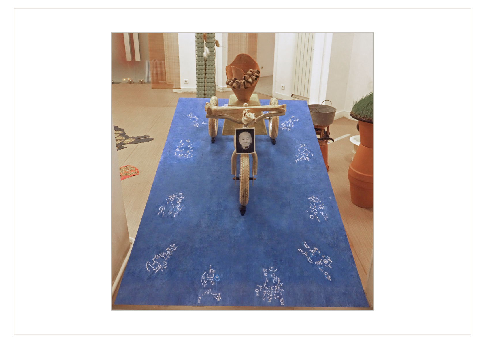 L’installation est à la fois un hommage à la mémoire de Mémé et une célébration des funérailles qu’elle n’a pas eues lorsqu’elle mourut à l’âge de 93 ans, peu après notre rapatriement en France en 1956.