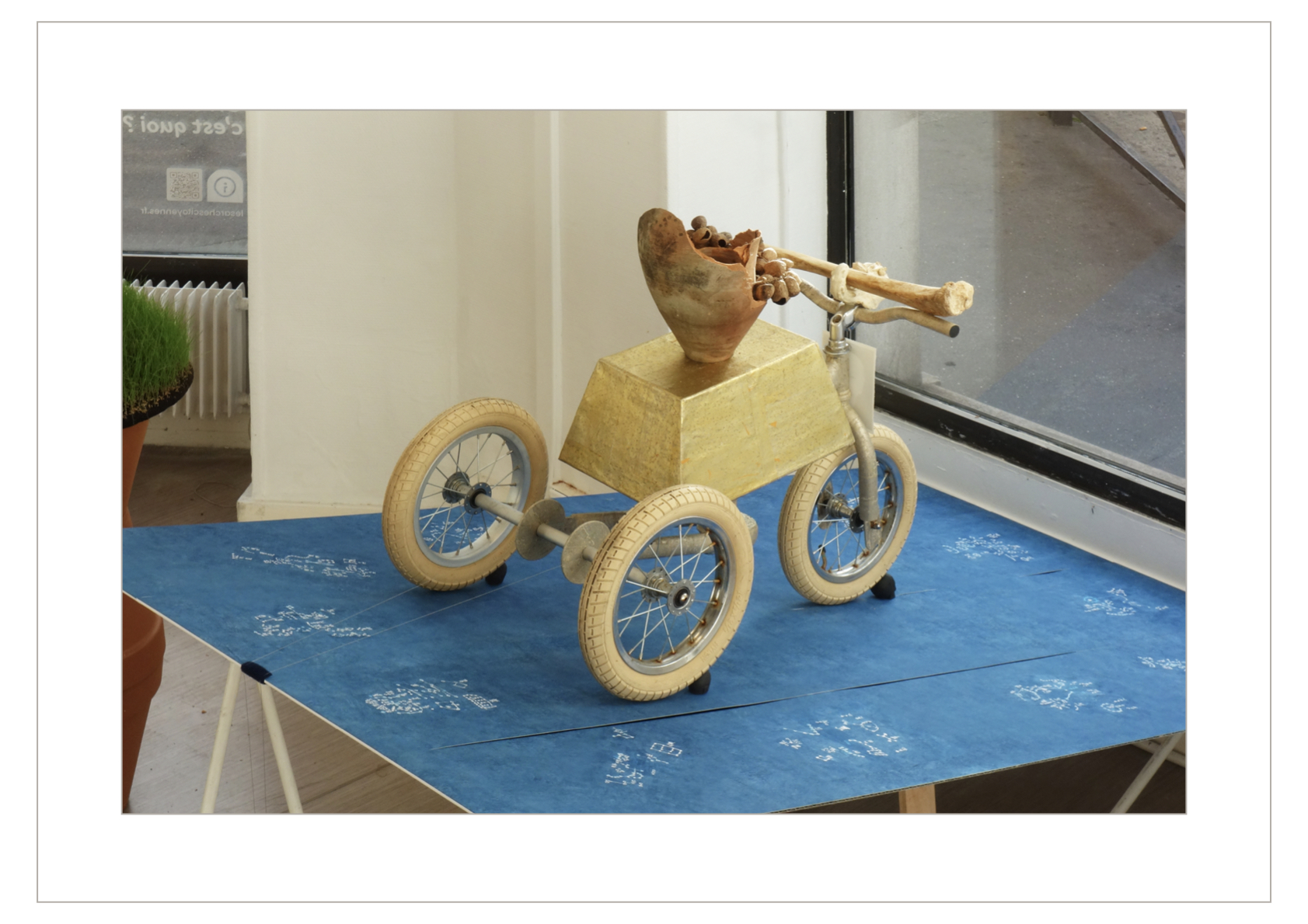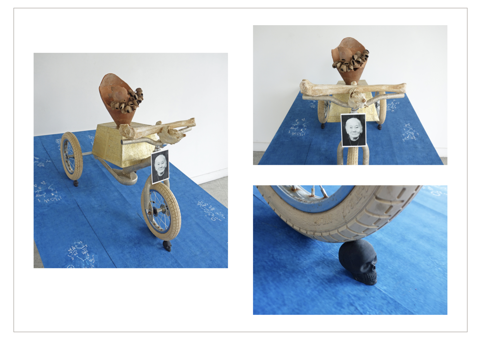 Matériellement, l’installation De l’absence de crainte présentée aux Vitrines des Arches à Paris était organisée en trois espaces visibles à travers trois vitrines. L”espace central, la plus importante, représente le corbillard pour Mémé, fabriqué à partir d’un tricycle d’enfant recouvert de papiers votifs argentés et dorés, placé sur un calendrier céleste chinois regroupant les constellations.