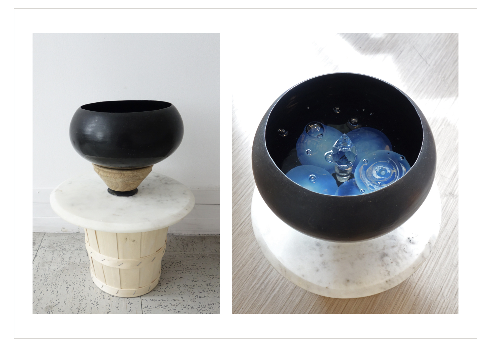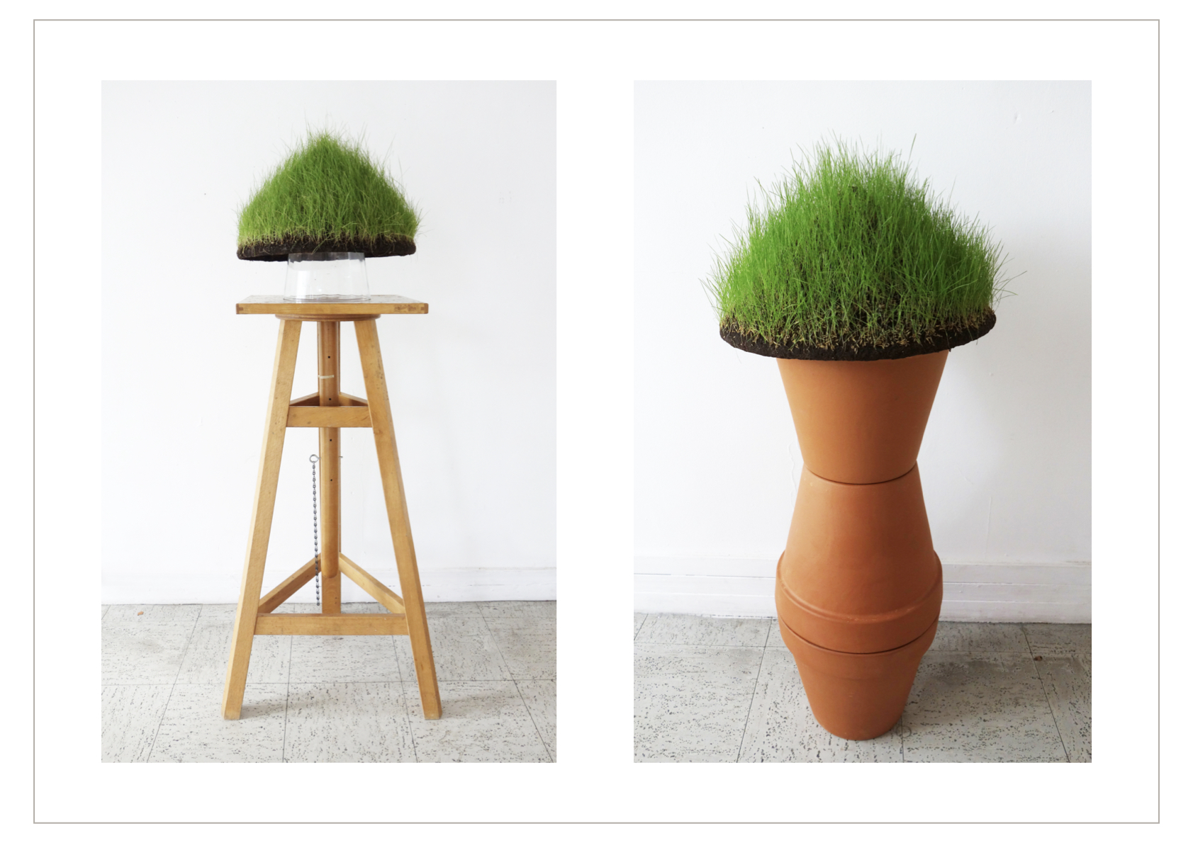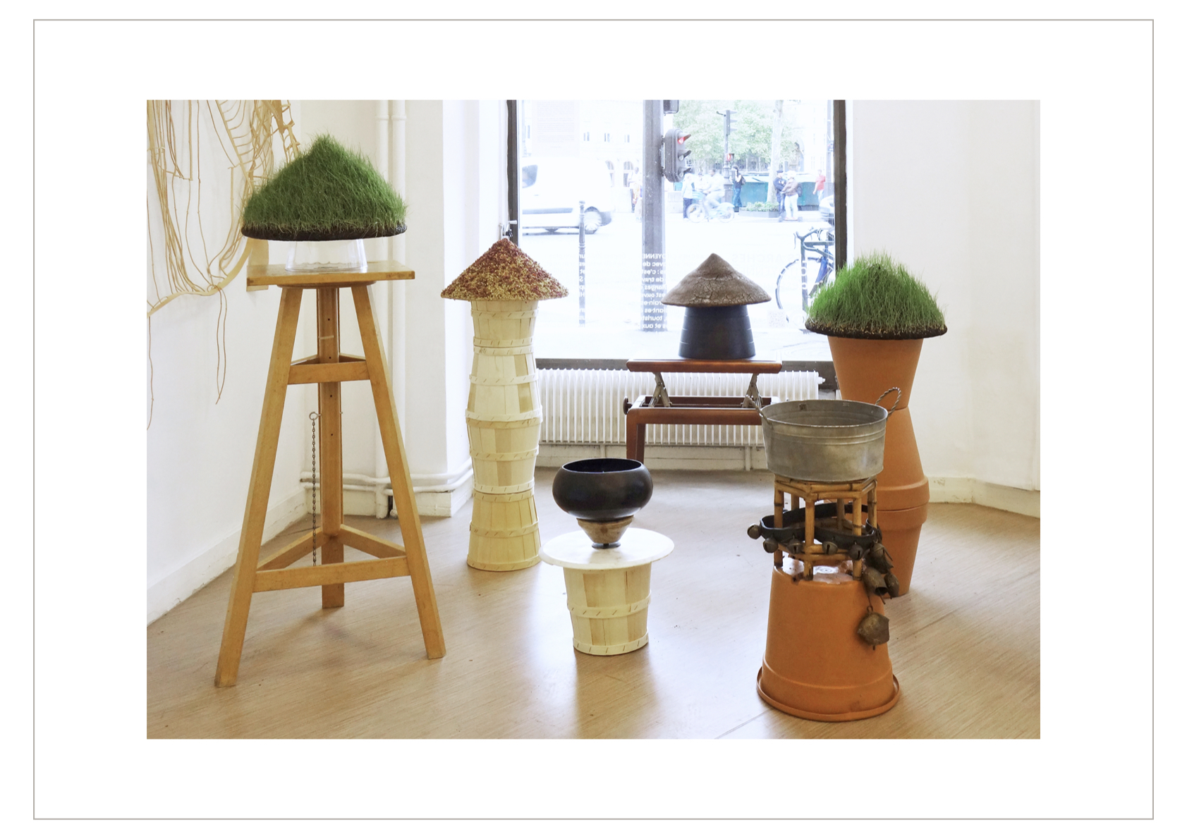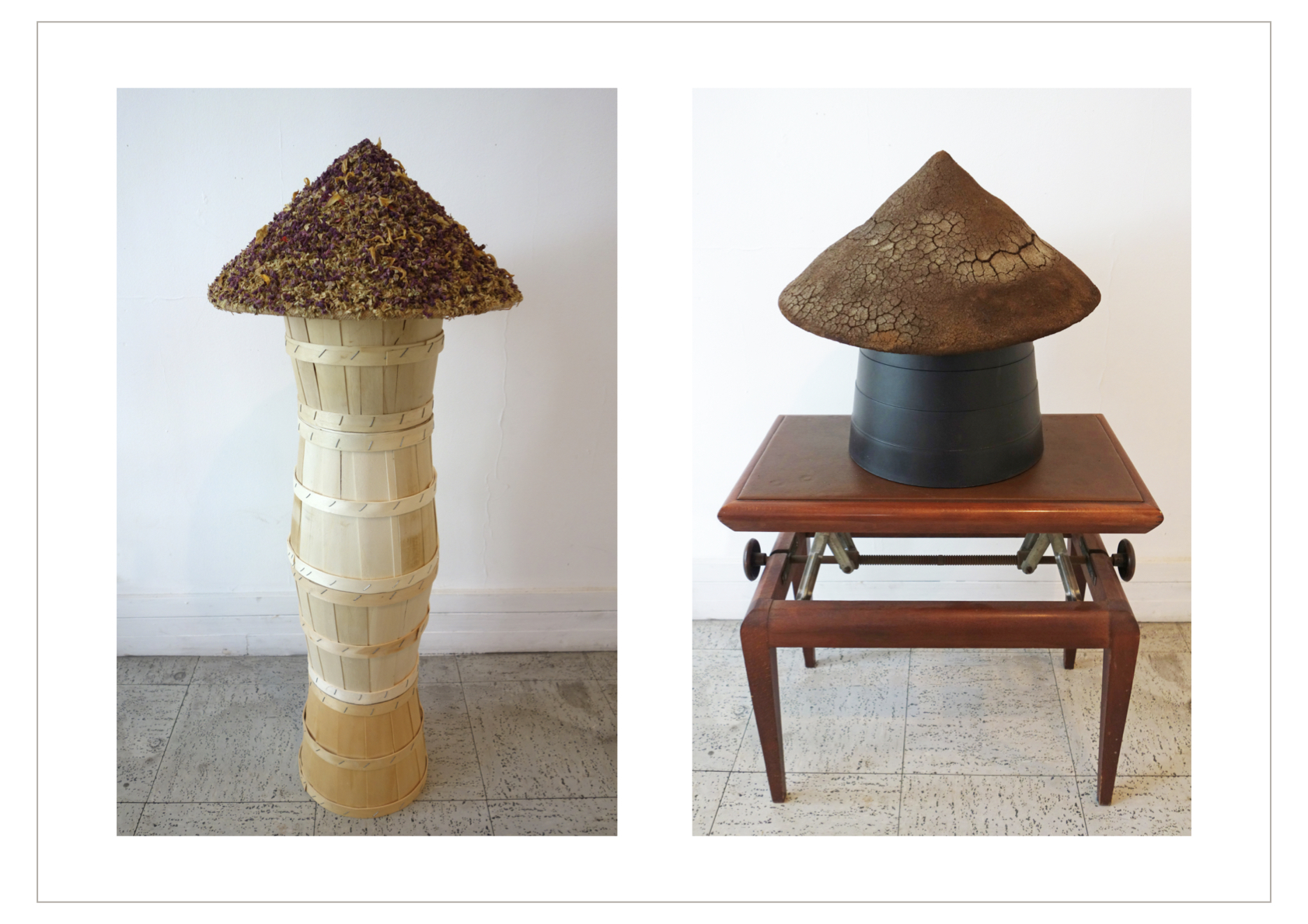 L’espace de gauche évoque la plantation que Mémé a gérée seule pendant plusieurs décennies après la mort de son mari ; des chapeaux coniques vietnamiens recouverts de fleurs ou de marc de café évoquent ses principales cultures, le thé et le café. D’autres chapeaux coniques servent de supports à une végétation de jeunes pousses d’herbes, et faisant corps avec leurs socles deviennent des sculptures vivantes. La présence du fumier de bétail est pour rappeler la nécessité de cet engrais à la culture du café. Un bol d’eau laqué noir est une offrande de feuilles en opale et de fleurs de lotus en cristal, symbole de l’éveil et de la renaissance.